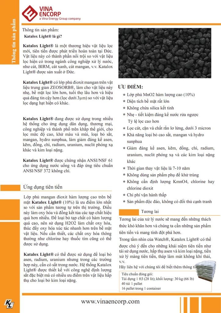 Katalox Light(® là một thương hiệu vật liệu lọc mới, tiên tiến được phát triển hoàn toàn tại Đức. Vật liệu này có thành phần nổi trội so với vật liệu lọc hiện có trong ngành công nghiệp xử lý nước, như cát, BIRM, cát xanh, cát mangan, v.v. Katalox Light® được sản xuất ở Đức.
